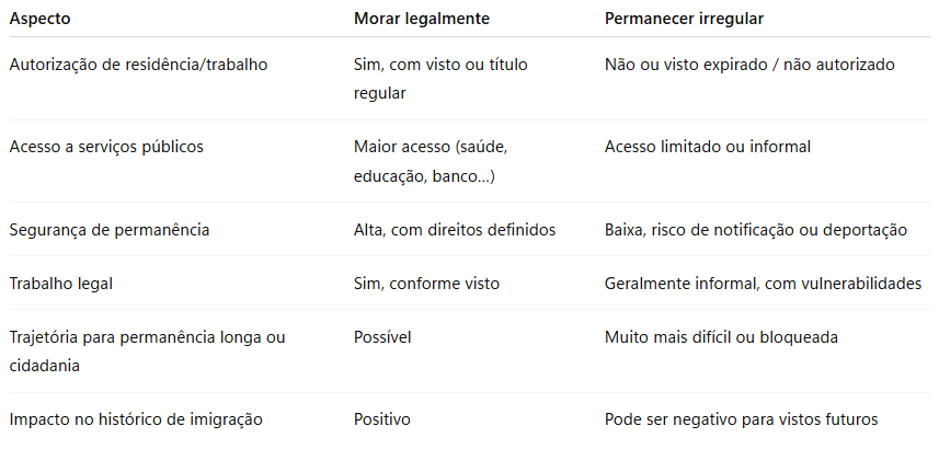 Essa condição traz várias consequências negativas — e mexer com a legalização após estar irregular é mais complicado do que ingressar no país já conforme as regras.
